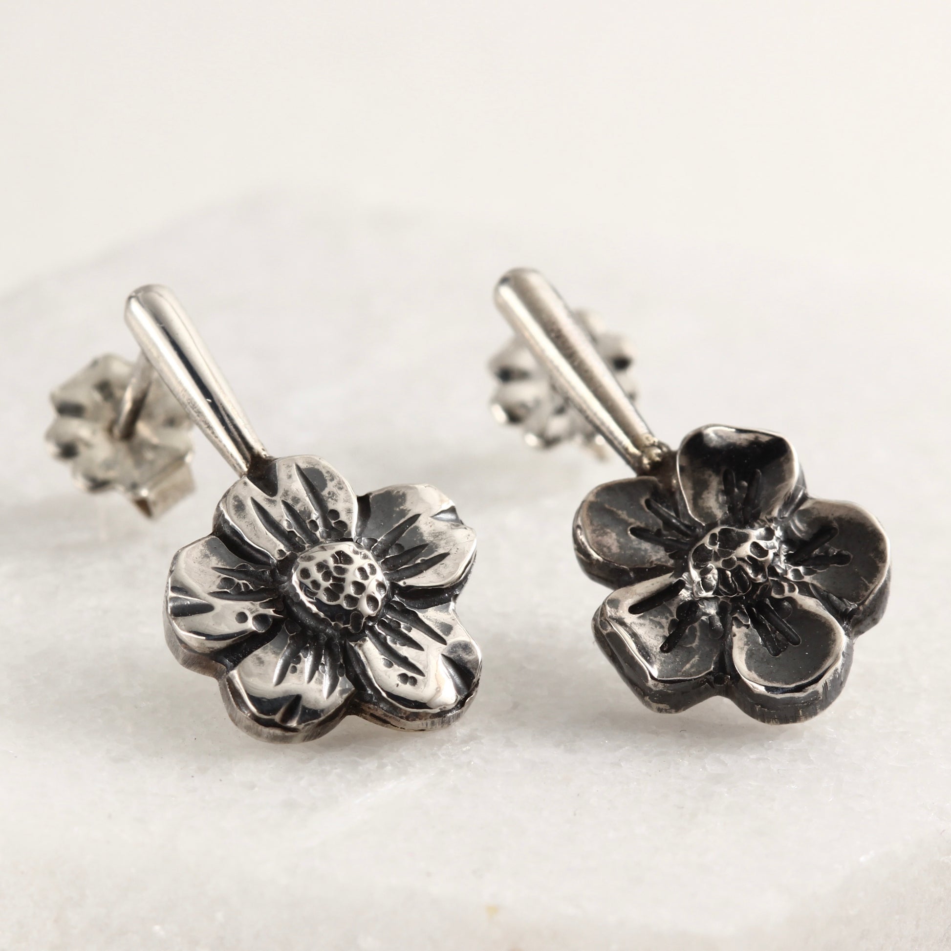 These earrings echo the form of the Wild Bloom Studs, with each flower shaped by hand in sterling silver using chasing and repoussé. Set on a slender stem, the bloom sits just below the ear, adding a sense of lightness and quiet movement.